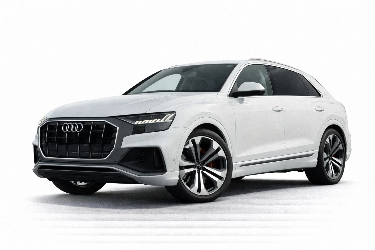The Q8 features Audi’s iconic Singleframe grille, sharp Matrix LED headlights, and aggressive S Line styling, giving it a sporty yet elegant appearance. The coupe-like roofline, muscular body contours, and large alloy wheels enhance its premium and athletic stance.