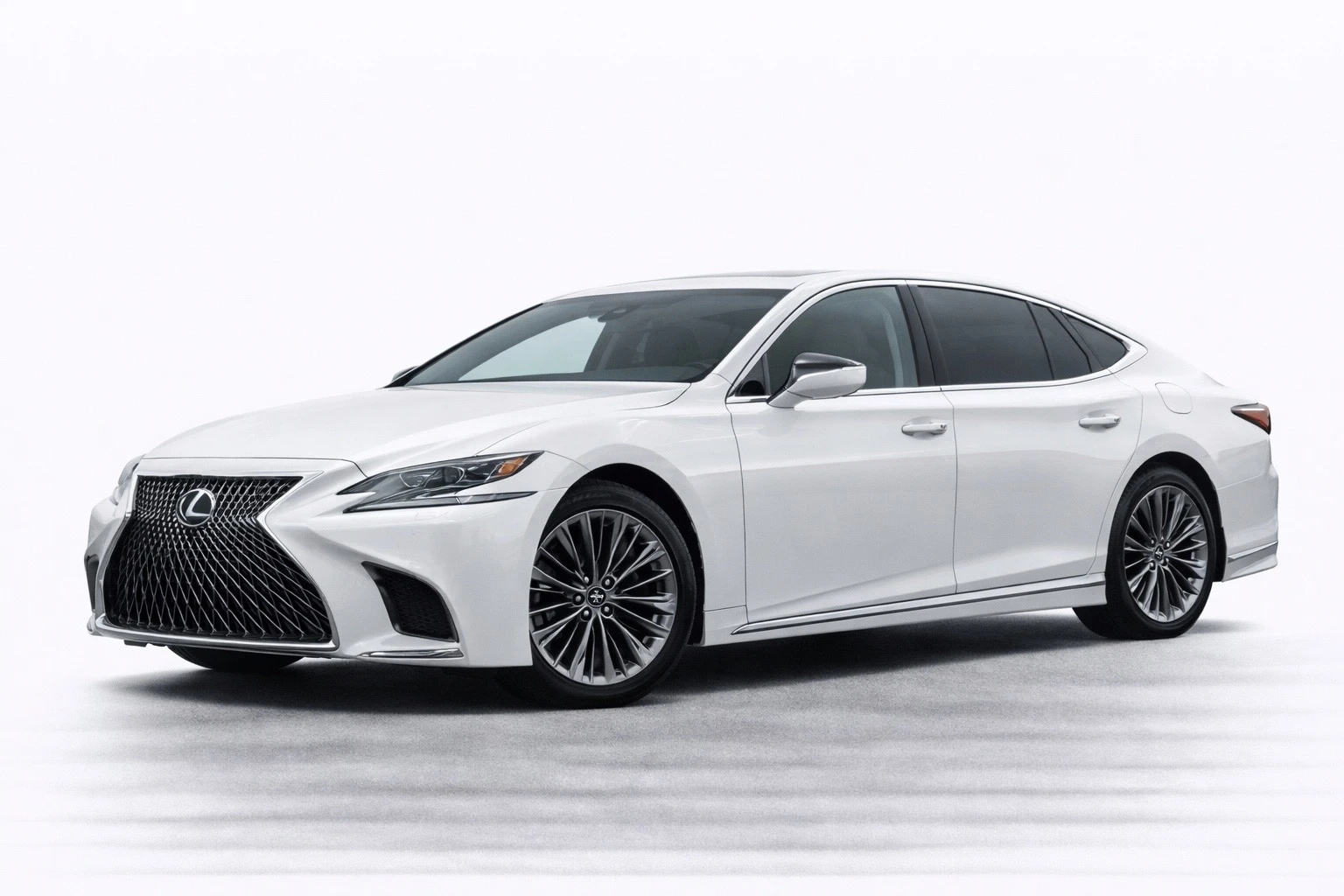 The Lexus LS500h features a bold and commanding exterior highlighted by the iconic Lexus spindle grille, sharp LED headlights, and aerodynamic body lines. Its premium paint finish and refined proportions give it a timeless executive presence suitable for business or personal luxury use.